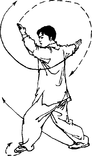 ①以右脚为轴,左腿提膝,身体右转240°;左臂外旋,收掌于 腰间,随身体右转,绕腰向前穿出,掌心朝上;右臂内旋,随身体 右转,在头上绕环一周,掌心朝上,掌指朝左。目视左掌方向(图 3 - 200)?