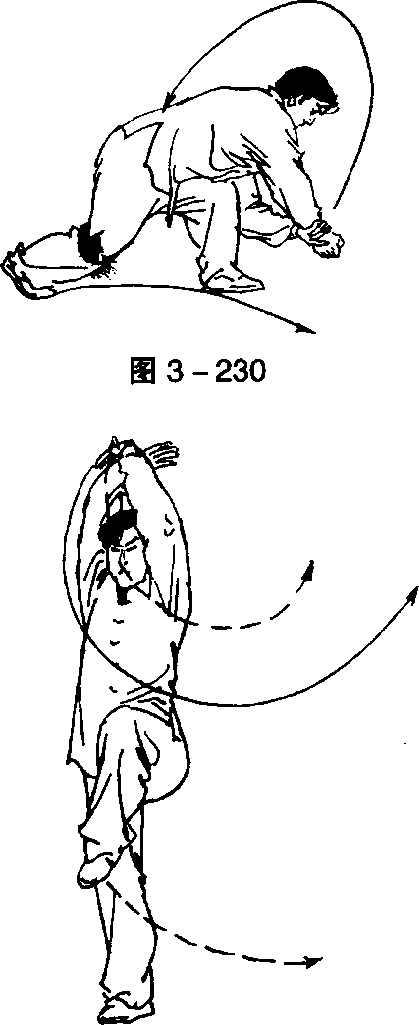 ②左臂外旋,屈肘下落,掌心向上;右臂握拳,直臂向上、向 前、向下劈拳于左掌上(左掌接握右前臂)。目视两手处(图3- 230) o