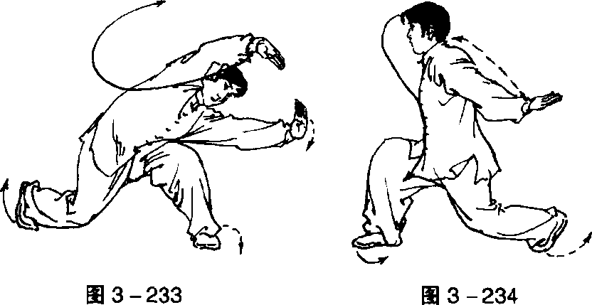 两臂下落,收至腰 间,以后动作与右双撞掌 完全相同,惟左右相反 (图 3 —233)。