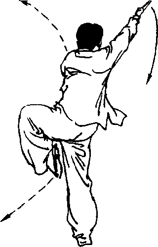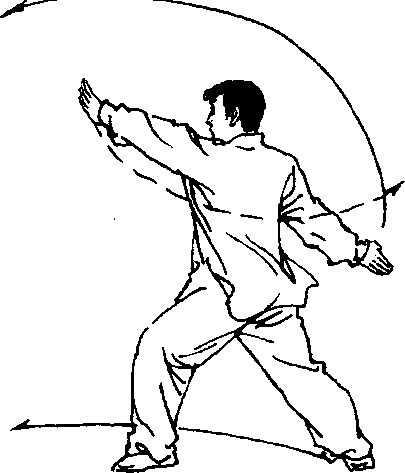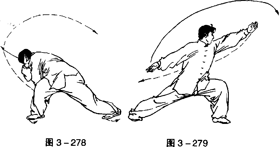 ①上体抬起,身体右转;右 臂向左、向上、向右、向下抡转一 周,至右胯侧,左臂打开,向右划 弧。目视前方(图3-273)。
