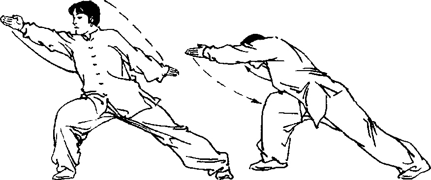 穿掌要快速有力,尽力远 伸,右腿立直要稳。