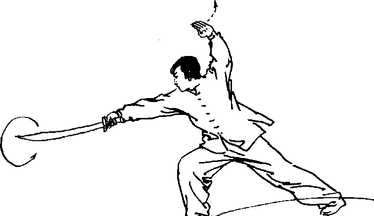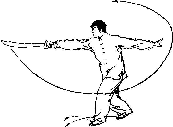 ②动作不停。在空中两脚分开,右脚在前,左脚在后,落地 时,右腿屈膝,左腿蹬直,两脚内扣,成右弓步;右手持刀向上、向