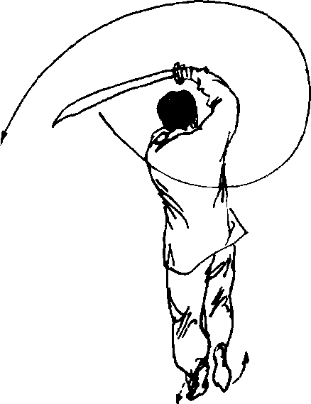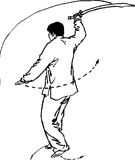 前弧形劈刀,略低于肩;左臂 随之向后、向上摆出,于头顶 左侧上方成横掌。目视刀(图 4-58)o