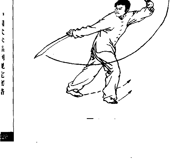 ffi 4-59目随刀转(图4-60)。四、动作不停。左转体,右蹬地转体要协调 一致。31.腾空转体云 刀①左脚前跨一步 蹬地,右腿前摆,向上 腾空,上体左转;右手 持刀,屈腕向前、向上 挂刀;左掌向右肩绕环 成立掌,贴于右肩侧。图 4 一 60