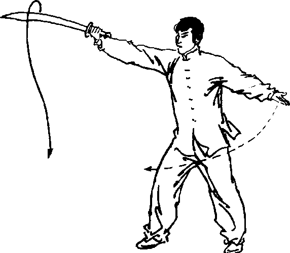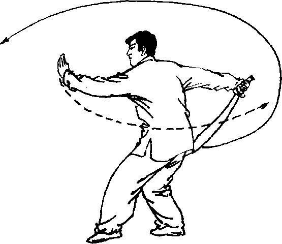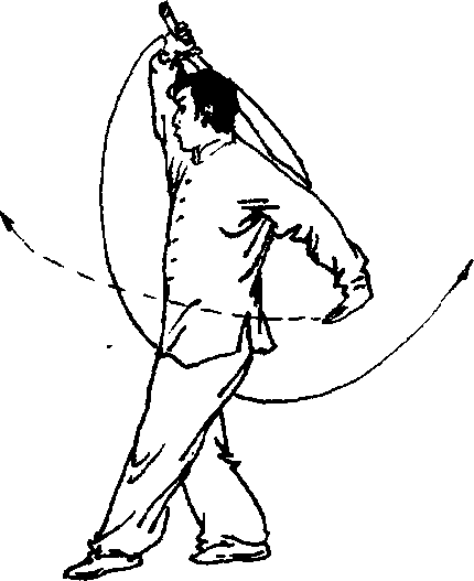 图 4一72图 4一73朝下,刀背贴紧身体,刀尖朝左后上方;左掌随上体左转,向下、