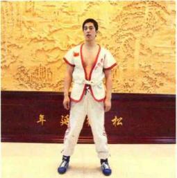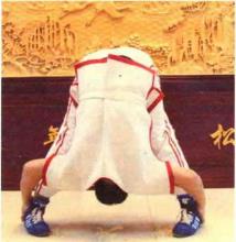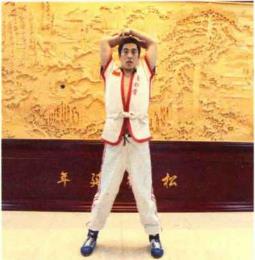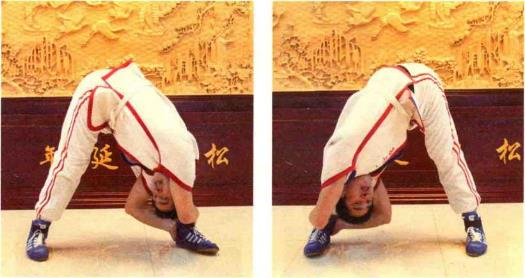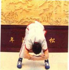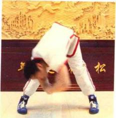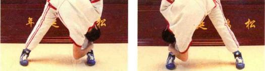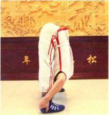第5组动作:站姿同上,左、右手分别从外侧握住左、右脚脚踝,用力向下弯腰, 头部尽量伸向双腿后面。这种训练方法称为“回头望月”。