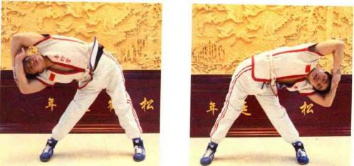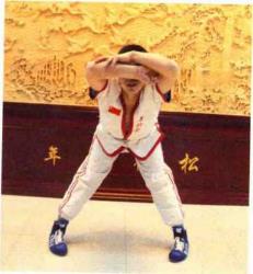 第1组动作:双脚分开站立,比肩稍宽,脚尖稍微向内;双手抱住另一侧肘部, 抬头,用力弯腰。这种训练方法过去称为“扇筋”。