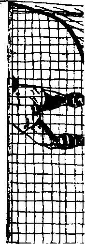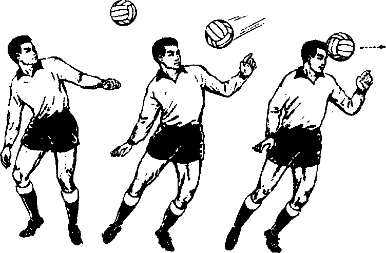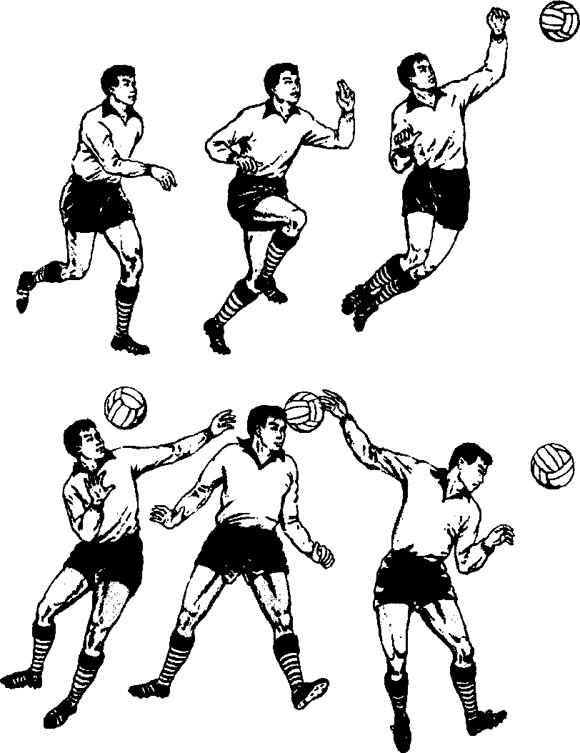 用前额击球的下 部,这样可将球 向上从进攻队员 头顶上方顶出。