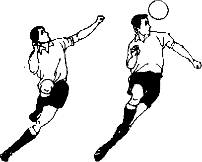 选择正确的踏跳点,单脚踏跳,两眼注视来球;跳起后身体 后倾;顶球刹那,利用转体、甩头向前伸顶的动作,,以正额骨的 侧面部位顶球。