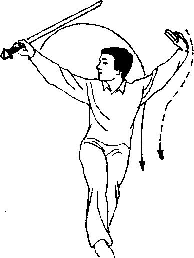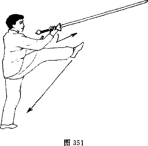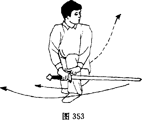 图352图352图352图35226. 摆步转身右点膝剑 接上式,摆右步,同时右手剑 锋斜点膝。左手掐诀至头顶左 上方。目视剑尖(图352)o27. 返首抽身摘盔平托转 剑 接上式,跟着坐腿、抽身, 两手平推摘盔剑,在抽转身的 同时变左弓步。右手持剑继续 平推向左转走,左手掐诀向左 前方斜指。目视前方(图353)。