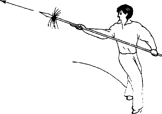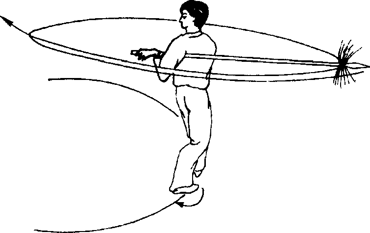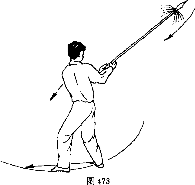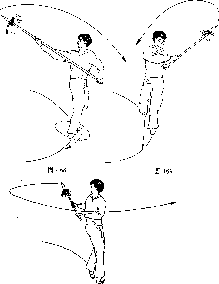 接上势,上右步,同时双手持枪,由上向后砸,要极力向右拧腰,右手手心向上,左手心向下,目 视枪头(图470)。2. 抽打云枪 动作不停,摆左步大转身,同时双手持枪,由右向左再向后抽打云枪,目向后看(左后方)(图471)。3. 行步扎枪 接上势,摆右步转身,同时右手前移,'目 视前方(图472)。动作不停,再上左步,同时枪向前扎出,目视枪尖(图473)。