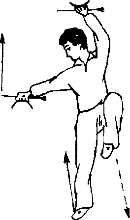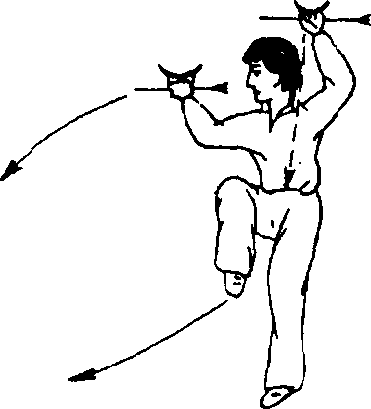接上势,左脚后退落地,右脚提起,同时 右手钺向上向后拉回,拉至头左前上方,手心向右,左手钺不 动,手心向左,目视右手钺(图570) o