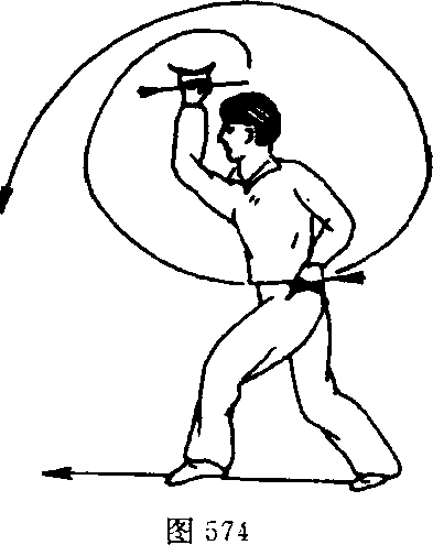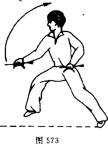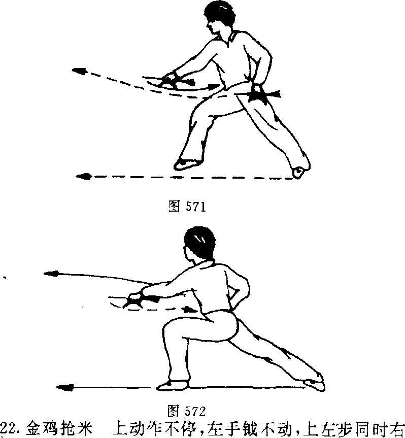 20. 金鸡吃米 接上势,进右步同时右手钺向前扎出,手 心向左,左手钺下落于左胯前,目视右手钺(图571)。接上势, 再上左步,同时左手钺向前扎出,右手收回于右胯前,目视左 手钺(图572)。接上势,再上右步,同时右手钺向前扎出,左手 钺回于左胯前,目视右手钺(图573)。