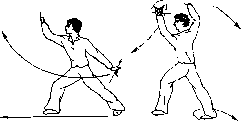 接上势,扣左步转身进右步,同时右手钺 由左向右经右肋前划弧向前推出(东方),手心朝上,左手钺往 后翻,手心斜向下,目视右手钺(图611)。