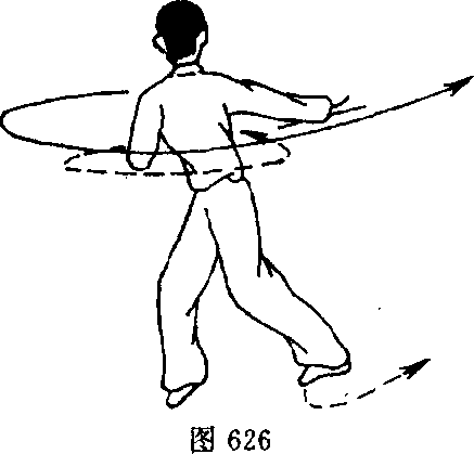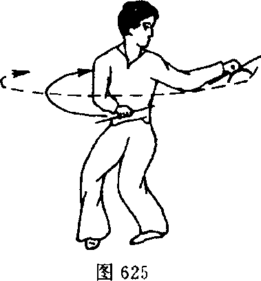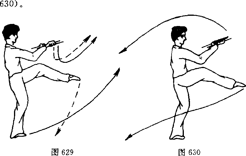 要点:脚向前踢钺向上托,目视两钺(图629)。