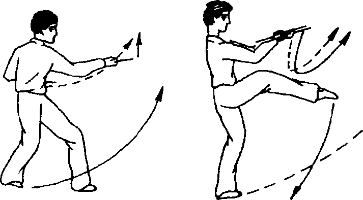 55.迎风挥扇 接上势,抬起右腿,向前平踢,脚尖朝前脚 面要平,两钺由下往上托,右手钺在上,左手钺在下,两手心皆 向上。