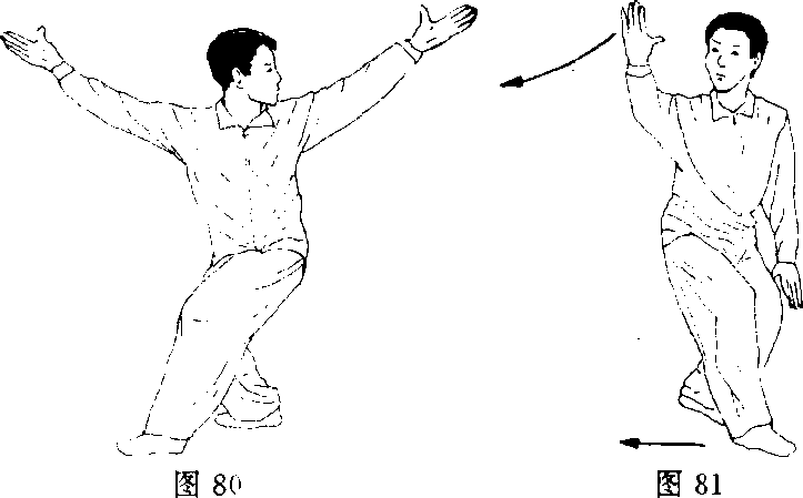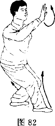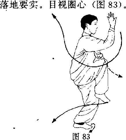 换式:当行转到西南角时,右足向圈心跨步、左足跟半 步,同时右手上挑于头顶上,掌心朝上,左手向北打向心掌。 目视右掌(图81)。左腿后撤半步,右腿曲膝上提,右掌同时抽回掩肘,右 臂对头面正中线;掌心朝北。左掌曲臂抱于右肘底,掌心向 下。重心落于左成独立式。目视前方(图82)。2.金鸡抖翅换式:左足蹬地,身体向东方跃起,右臂向东开抖,右 掌心朝天,左掌撑劲于左侧,身体对北方,左掌心朝地。双 足同时落地,发劲要整、