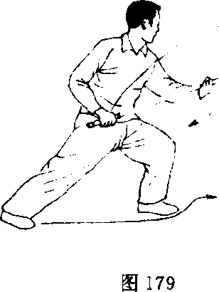 右手翻腕合把,杆头由东经上向正西 摔击。目视杆头(图179)。