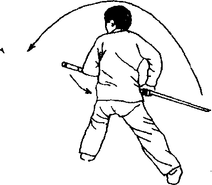 10. 右手向上带杆,左手翻腕合把,杆头由东经上向正 西摔击,面向正北。目视杆头(图181)。