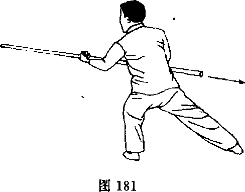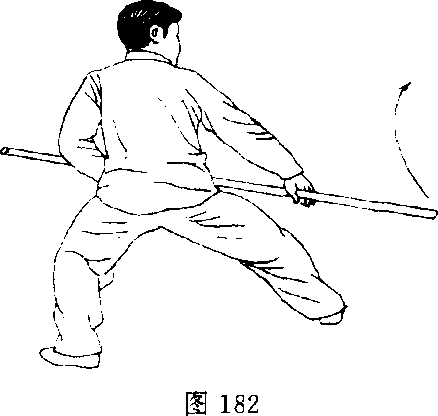 11. 顺右步,跟左步,杆尾向正东直踱。目视杆尾(图 182).