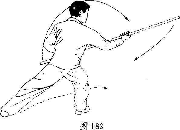 12. 左手向上带杆,右手翻腕合把,杆头由西经上向正 东摔击,面向正北。目视杆头(图183)。
