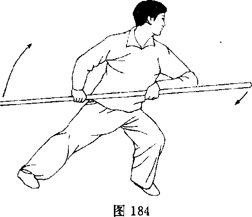 右手向上带杆,左手翻腕合把,杆头由西经上向正 东摔击,面向正南。目视杆头(图184)0