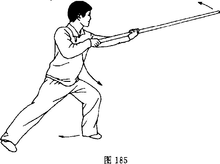 换式: ?蹲身,左手上挑,右手向下按把,杆头上崩,敲打对方 手指.目视对方(图185)。