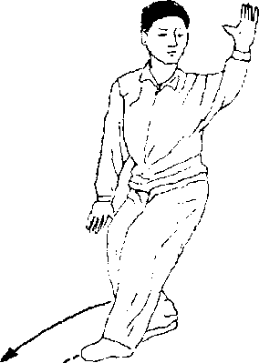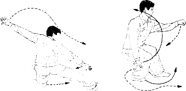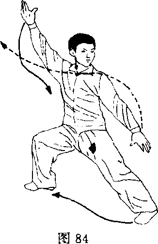 换式:身体扭向正南,重心落于左腿。右掌掌心向北与 右腿同时向西撒出,右掌沿右腿外侧面下戳,肩要松。左掌 对称用力,掌心向北,向东上方撑掌。目视右掌(图85r