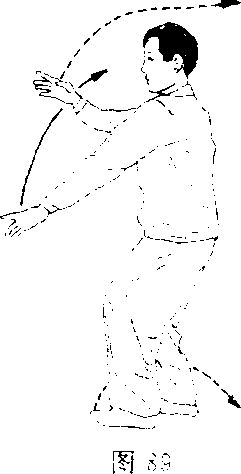 换式:顺右步于正西,扣左步,左手掌同时自上一而下扑 抓,抓到胸前变握手式。右手翻拧位于右腿外侧,掌心向下。 目视左手(图86)。 .
