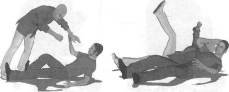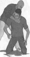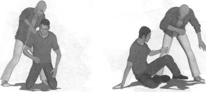 动作说明实战中出于主动或者被动情况下我双膝跪地对手上步由背后扑来并伸出右臂屈肘欲勾锁我颈部(图5-27-1)我迅速重心下沉身体向左拧转头部由对手腋下闪过避开对手右臂令其进攻落空(图5-27-2)随即快速用右手抓住对手右臂肘使劲向其裆部方向推撑左手同时伸至对手身后推撑其臀部双手交错用力双脚配合上肢动作一并踩住对手左脚踝关节部位(图5-27-3)对手由于身体重心不稳上体将向前栽倒(图5-27-4)我上下肢协同动作瞬间可将对手向前摔倒(图5-27-5)。对手仰面倒地的一刹那我迅速用左手扣抓住对手下颌或者颈部同时右拳以拳轮为力点用力向下砸击对手胸腔予以致命打击(图5-27-6)