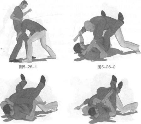 动作说明实战中对手趁我不备突然俯身前冲伸出双手抱住我双腿用力将我掀翻在地(图5-26-1)在我倒地瞬间对手猛然前扑伸出左手欲卡掐我咽喉同时用右拳击打我头部我迅速提臀双腿屈膝抬起两大腿交错夹住对手腰部将其牢牢钳住防止其骑压我上身同时用左小臂向外格挡其右拳右手抓按住其左手腕部(图5-26-2)紧接着我左手迅速屈肘搂住对手脖颈部位并用力向头部左侧回拉同时右手抓住其左手向右上方推撑将其手腕从我胸前移开(图5-26-3)随即上体弯曲右手牢牢抓住对手左手腕左手由对手左大臂后侧插入经其肘窝穿过抓住自己右手腕部双臂协同动作以锁控其左臂肘双腿配合夹紧对手腰部令其无法逃脱继而可以向左侧翻滚以彻底制服对手(图5-26-4)