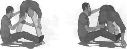 动作说明实战中出于主动或者被动情况下我双膝跪地对手上步由背后扑来并伸出右臂屈肘欲勾锁我颈部(图5-25-1)我迅速向右拧转身体身体重心向后移动臀部着地闪身避开对手的进攻(图5-25-2)对手由于用力过猛身体势必会摇晃重心不稳我顺势伸出右手抓住对手左手腕部用力向后牵拉同时双脚猛然蹬踏其双脚(图5-25-3)迫使对手身体丧失平衡而跌摔于我体侧(图5-25-4)。对手倒地瞬间我迅速团身双手拉住对手左手臂借助对方的力量就地旋转(图5-25-5)身体旋转停止时左腿由对手左臂下方穿过下压控制住对手上体胸腹部右腿随势控制住其头部双手同时用力向后拉扯以腹部为支点顶别对手肩、肘关节部位以将其彻底制服以身下(图5-25-6)