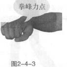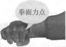 当手掌的五个指头屈握在一起成为拳头的时候它就瞬间演变成了一件坚实有力的打击武器同时它也形成了具备自身特点的多个打击力点就像刀的着力点是刀刃枪的着力点是枪尖一样拳也同样拥有自己的着力点根据其用法的不同可分为拳面(图2-4-1)、拳背(图2-4-2)、拳峰(图2-4-3)、拳轮(图2-4-4)、拳眼(图2-4-5)。