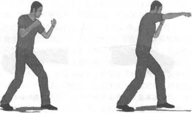 动作说明首先按左前式基本格斗站姿站立(图2-4-6)。发拳时左脚向前上一小步右脚随势跟进半步并以右脚掌蹬地身体略前倾重心前移同时拧腰转胯右肩前送右臂随势直臂内旋、向前直线冲出拳心向下力达拳面左手屈肘回收置于下颌附近目视前方(图2-4-7)
