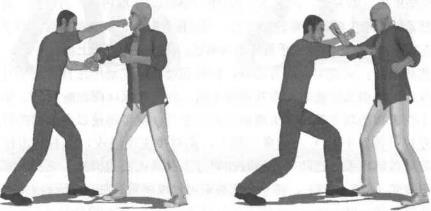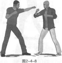 实战应用实战中双方对峙伺机而动。我主动用左直拳逗引对手佯装攻击吸引其注意力令其视线不清判断错误(图2-4-8)如对手用右手向下拨挡我左拳其头部就会露出空当我可迅速以右直拳击打对手面