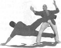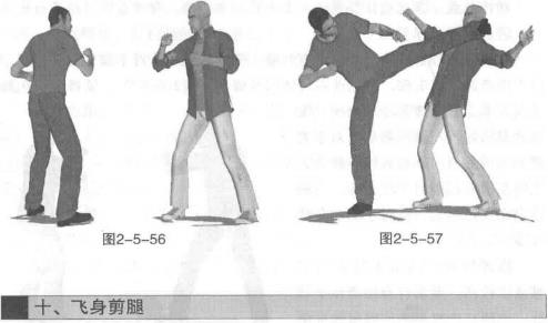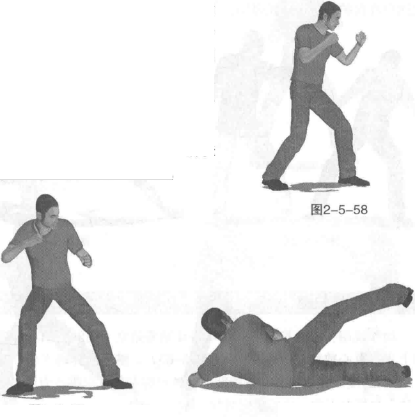 图2-5-59图2-5-59图2-5-60图2-5-60动作说明首先按左前式基本格斗站姿站立(图2-5-58)随即右脚尖外展身体向右侧拧转双腿屈膝重心略下沉(图2-5-59)紧接着身体再猛然向左转动双腿蹬地跃起身体向左前方跃起侧倒身体着地瞬间左腿向后勾右腿向前横扫双腿形成交错剪状侧身着地双臂屈肘扶按地面支撑目视右脚(图2-5-60)