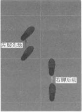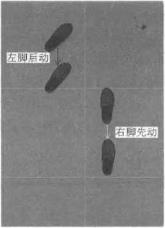向前滑步时后脚先蹬地在蹬地的同时使身体前移推动前脚向前滑动。前脚向前移动时要沿地面滑动不要抬脚过高。前脚脚尖不要转动应保持原来的姿势。落地时不能用脚跟着地而应用前脚掌内侧着地当前脚掌着地时后脚迅速前滑跟上(图2-2-1)后脚跟进时也要擦地滑行切忌在蹬地后将脚抬起以避免形成向前迈步的现象影响身体重心的稳固性。后脚前滑落稳时仍应保持在滑动前的状态。后脚前移的距离要与前脚移动的距离相同。向前滑动的步幅一般不宜太大应根据个人的身高而