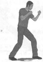 动作说明首先按左前式基本格斗站姿站立(图2-5-76)身体重心向前移动右腿随之屈膝抬起膝与胯齐高右脚向上勾起左腿独立支撑(图2-5-77)。随即右脚用力向下垂直踩踏力达全脚掌掷地有声目视地面出腿瞬间呼气(图2-5-78)