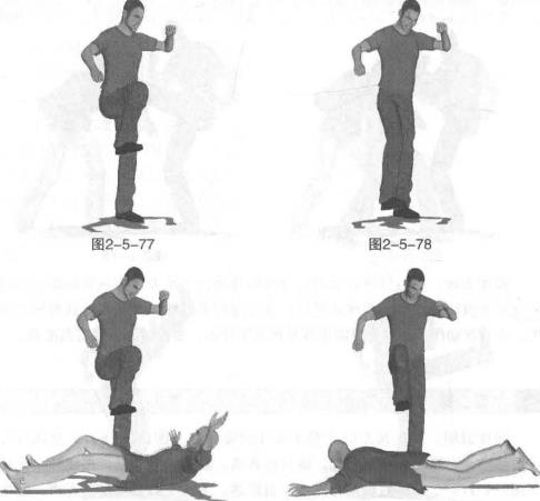 实战应用踩踏技术一般主要应用于地面格斗当将对手制服或摔倒在地以后对其进行进一步地打击。如果对手是仰面倒地可以踩踏其胸部或者腹部(图2-5-79)如果对手面部向下俯身摔倒可以踩踏其后背、腰椎等部位(图2-5-80)