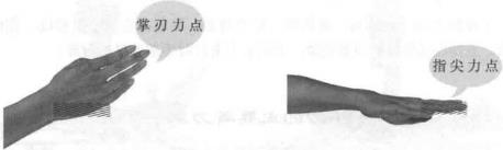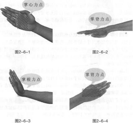 手刀的着力点根据其用法的不同可分为掌心(图2-6-1)、掌脊(图2-6-2)、掌根(图2-6-3)、掌背(图2-6-4)、掌刃(图2-6-5)、指尖