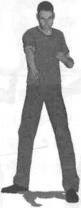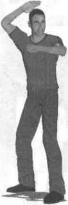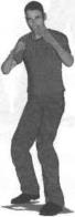动作说明首先按左前式基本格斗站姿站立(图2-6-62)出手时右拳变成手刀形状屈肘、内旋向头部上方抬起手心斜向前上方左臂屈肘护于胸前(图2-6-63)紧接着身体略向右转动右手掌直臂自头部上方向身体正前方下拍力达掌心掌心向下目视右手掌(图2-6-64)