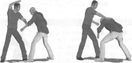 实战应用实战中敌我双方对峙。对手突然用左拳击打我胸腹部我迅速用左小臂用力向下格挡对手左小臂同时右掌高高抬起蓄势待发(图2-6-65)紧接着右掌向下用力拍打对手后背或者肩头令对手遭受重创(图2-6-66)