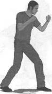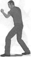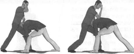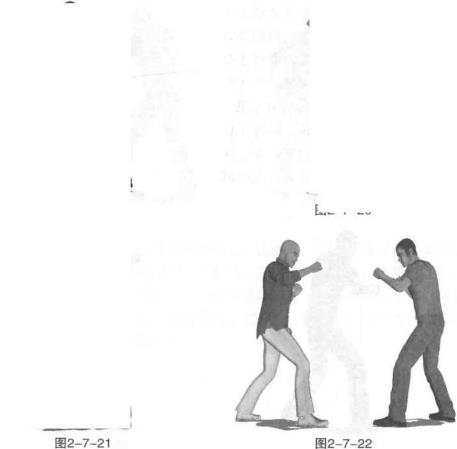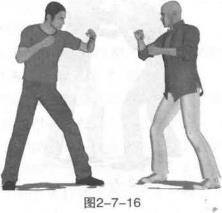 实战应用实战中敌我双方对峙(图2-7-16)对手突然俯身向前用双手抓抱住我前腿膝窝处并使近拉扯欲将我摔倒(图2-7-17)我迅疾伸出左手抓住对手右肩胛或按住其颈部令其无法抬头同时右臂快速抬起于身前突然屈肘向下钉砸对手后背力达肘尖制敌于瞬间(图2-7-18)
