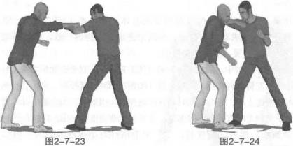 实战应用实战中敌我双方对峙(图2-7-22)对手突然用右拳击打我胸部我迅速以左臂向外格挡化解危机(图2-7-23)紧接着身体我猛然向左拧转右脚快速上步、进身同时右臂内旋屈肘以肘尖为力点随转体向前、向左横扫对手左侧太阳穴或者下颌部位令其头部遭受重创(图2-7-24)