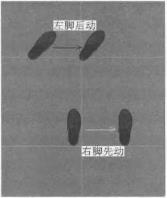 向左闪步时以后脚前脚掌为轴脚跟向右侧旋转大约45度。身体随着后脚旋转突然向左侧转动。同时前脚迅速向左侧后方移动一步改变了原来的站立方向(图2-2-5)完成动作后要保持基本姿势不变。闪步的动作虽不复杂但需要上体的动作来配合完成所以是技巧性较高的一种弟法。