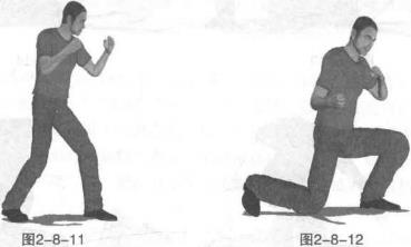 动作说明首先按左前式基本格斗站姿站立(图2-8-11)身体向左转动重心突然下沉右腿随势屈膝下蹲膝盖向下直接跪地力达膝盖目视前下方下跪瞬间呼气(图2-8-12)