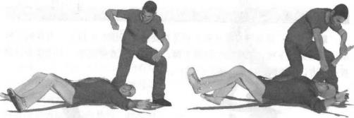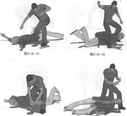 实战应用跪膝技术主要应用于地面格斗当将对手制服或摔倒在地以后对其进行进一步的打击其杀伤力强大往往是致命的最后一击。跪击的目标根据临场实际情况有所不同如果对手是仰面摔倒主要打击目标为头颈部(图2-8-13)、胸腹部(图2-8-14)、裆部(图2-8-15)。如果对手是俯身趴伏地面则打击的部位主要是后背、腰椎(图2-8-16),或者肩胛骨部位(图2-8-17)如果对手是侧身倒地则主要跪击其一侧软肋(图2-8-18)