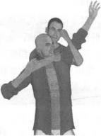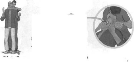 图3-1-16图3-1-16动作说明实战擒敌时我由背后接近对手(图3-1-16)突然右臂向前伸出屈肘以前小臂及肘窝部搂锁住对手脖颈部位同时左臂屈肘左手自上而下抓握住我右手腕部并用力向后拉扯以控制对手颈部使其咽喉受阻导致呼吸困难(图3-1-17)紧接着我左脚向后退一步双腿屈膝下蹲重心突然下沉两臂后拉令恐怖分子身体失去平衡向后摔倒右腿膝