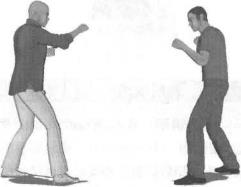 动作说明实战中敌我双方交手(图3-1-19)对手主动进攻突然左脚上步蹿进低头俯身伸出双手扑过来欲抱住我双腿进行扑摔(图3-1-20)此时我迅速反应将前腿向后撤回一步上身快速前俯同时伸出双臂用力环抱住对手头颈部将头和胸部紧紧贴靠在对手后背上双臂勒紧重心前移、下沉利用整个身体的重量将对手压倒在地(图3-1-21)