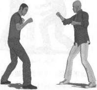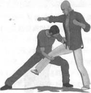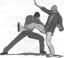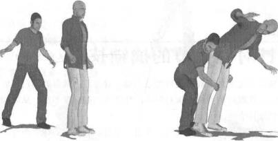 动作说明实战中我由对手背后悄悄摸进(图3-6-22)看准时机我突然从后面伸出双手自下而上搂抓住对手双腿将其掀翻在地(图3-6-
